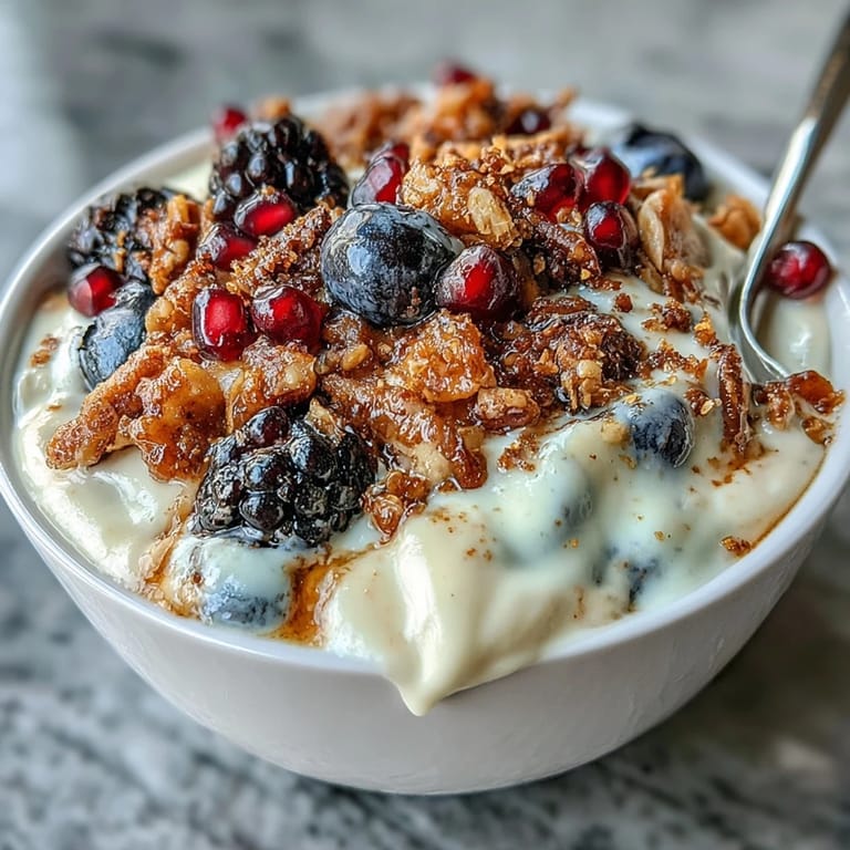 Save There's something about the quiet of a winter morning that makes a yogurt bowl feel like an act of self-care rather than just breakfast. I discovered this combination on a grey Tuesday when I was tired of the same scrambled eggs routine and wanted something that felt both indulgent and honest. The contrast of cold creamy yogurt against warm, cinnamon-spiced crunch became my small ritual—the kind of dish that doesn't require much effort but somehow feels intentional, like you're doing something kind for yourself before the day even starts.